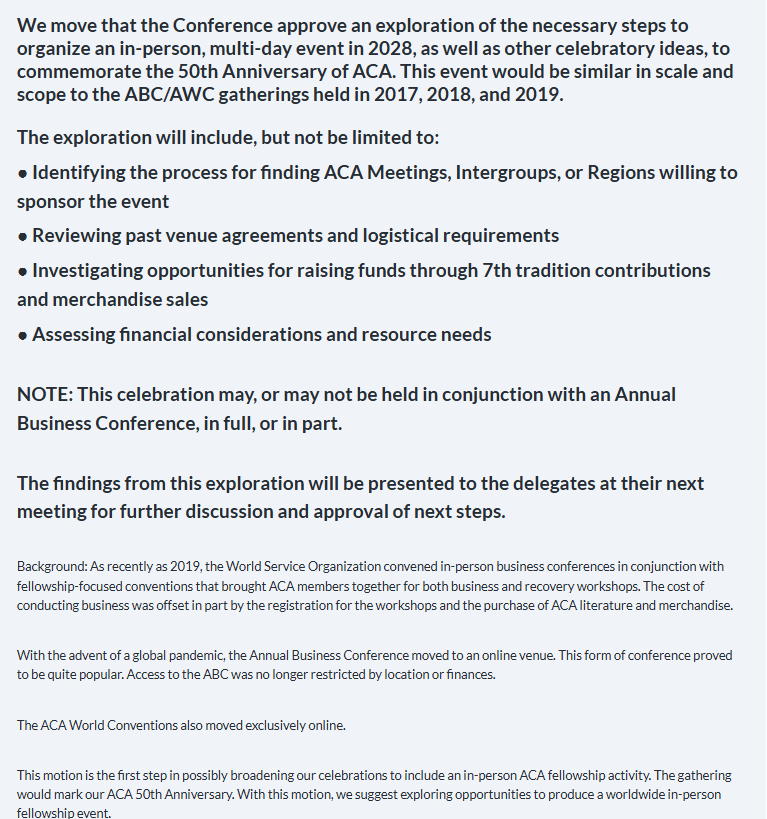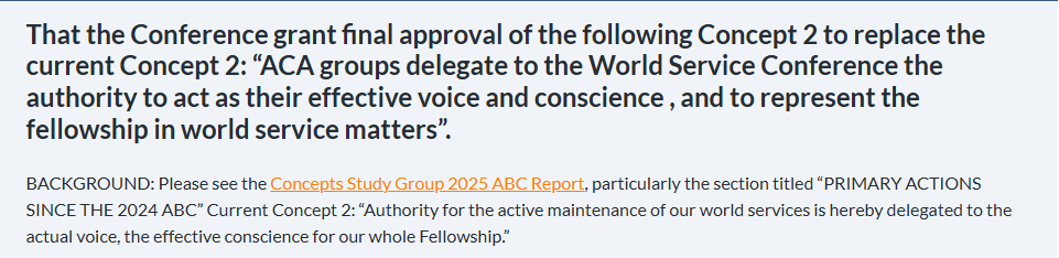 Delegates are chosen by registered ACA groups, intergroups, and regions, and the conference is commonly understood to serve as the voice of the fellowship.
