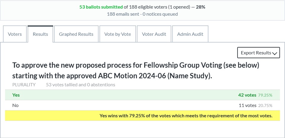 The voting results will be reported on the adultchildren.org website within two weeks after the close of voting. Discussion of the Fellowship Group Voting results will be requested to be added to the agenda for the 2026 Annual Business Conference. (ABC)