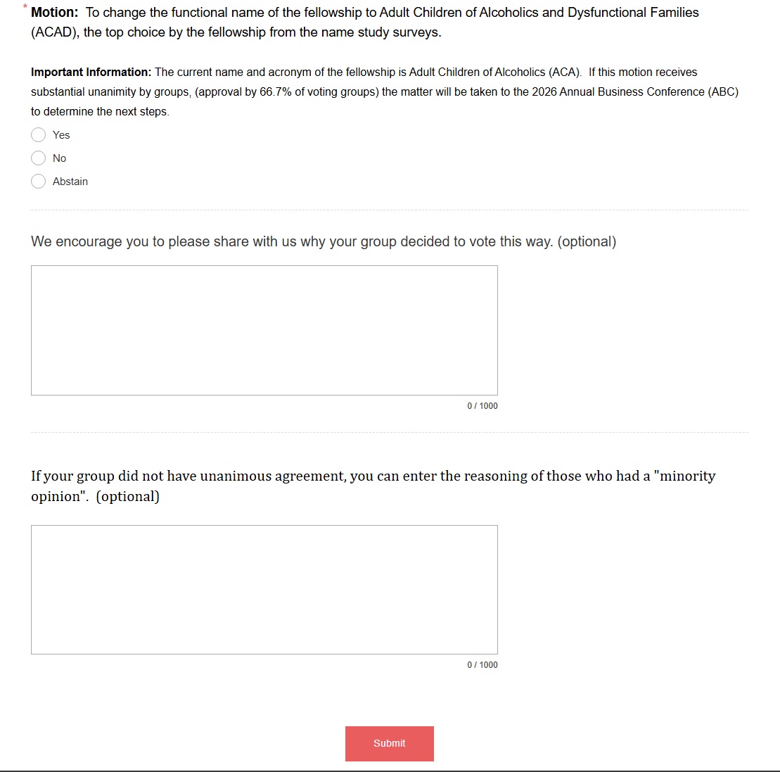 The voting results will be reported on the adultchildren.org website within two weeks after the close of voting. Discussion of the Fellowship Group Voting results will be requested to be added to the agenda for the 2026 Annual Business Conference. (ABC)